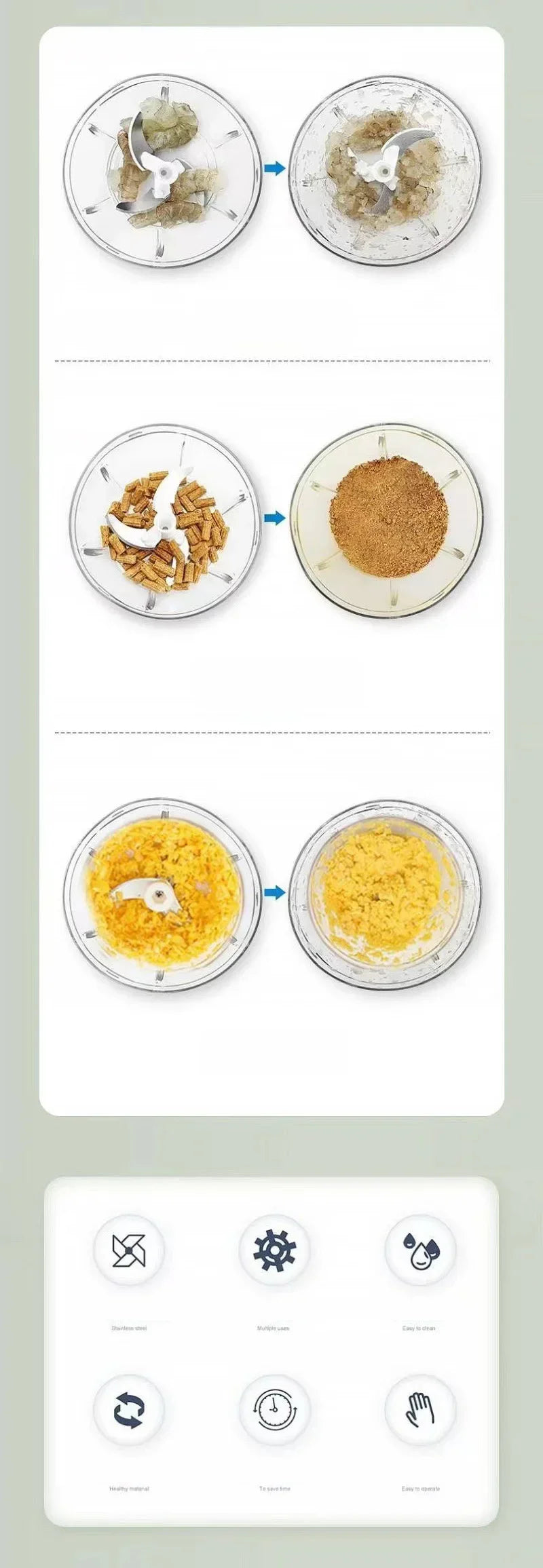 A quality product, durable, practical and easy to wash, which will help you a lot when preparing your delicious recipes. Very simple to use, it has a mechanism that works with a rope. When pulling the rope, the blades rotate inside the 500ml glass.