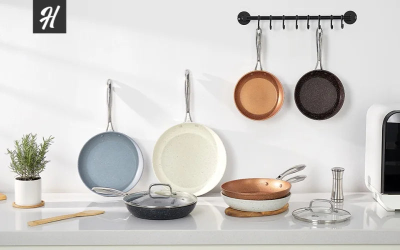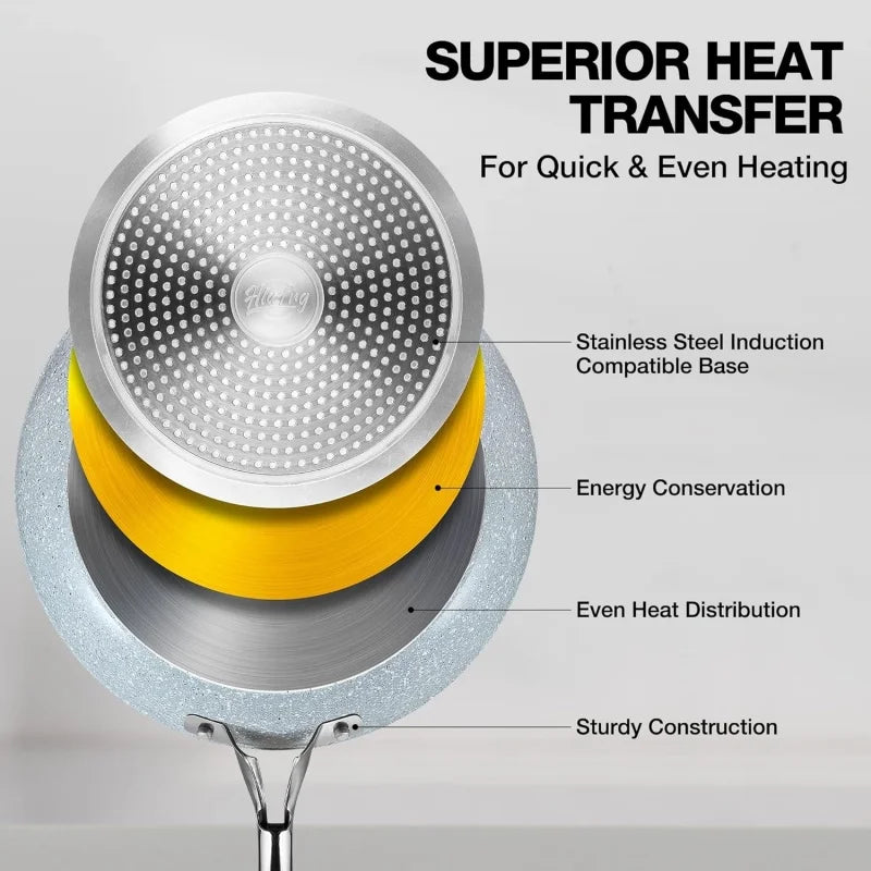 - INTERNAL AND EXTERNAL NON-STICK COATING- HLAFRG non-stick pan is composed of natural non-toxic marble material, with three layers of non-stick coating the inner and outer surfaces, which greatly enhances the non-stick performance of the pan, makes the whole pan easy to clean, and improves the durability of the pan.