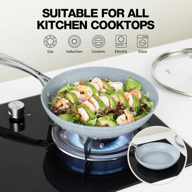 - HEATS QUICKLY & EVENLY-This marble frying pan with lid is made of professional-grade aluminum alloy with a stainless steel composite bottom sheet, no dead zones or hot spots, quick and even heat conduction, reduced cooking time, and quick enjoyment of delicious food.